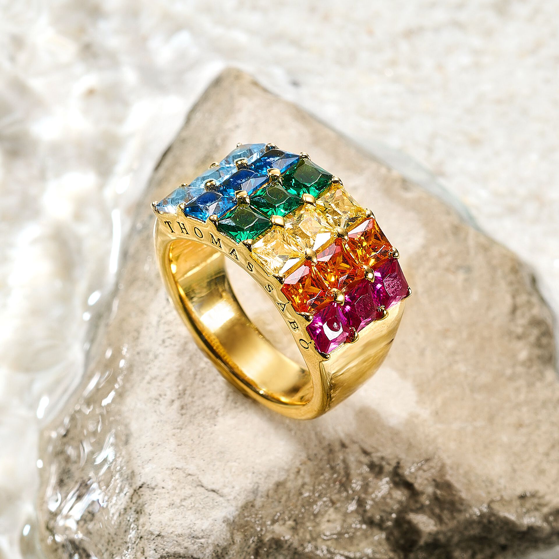 This large cocktail ring pays homage to iconic pieces of THOMAS SABO jewellery. 18 brightly-coloured stones in the colours of the rainbow are hand-set in a diamond-shaped setting to create an exceptionally beautiful sparkle.